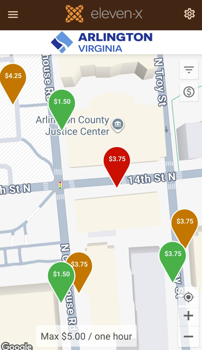 Another example of how eleven-x supports better parking experiences is through eXactnav, which provides real-time visibility into parking availability and pricing. In Arlington County, Virginia, prices are adjusted on a quarterly basis based on demand. Visualizing the price and availability on eXactnav makes it easier for drivers to make an informed decision on where to park, balancing curbside utilization.